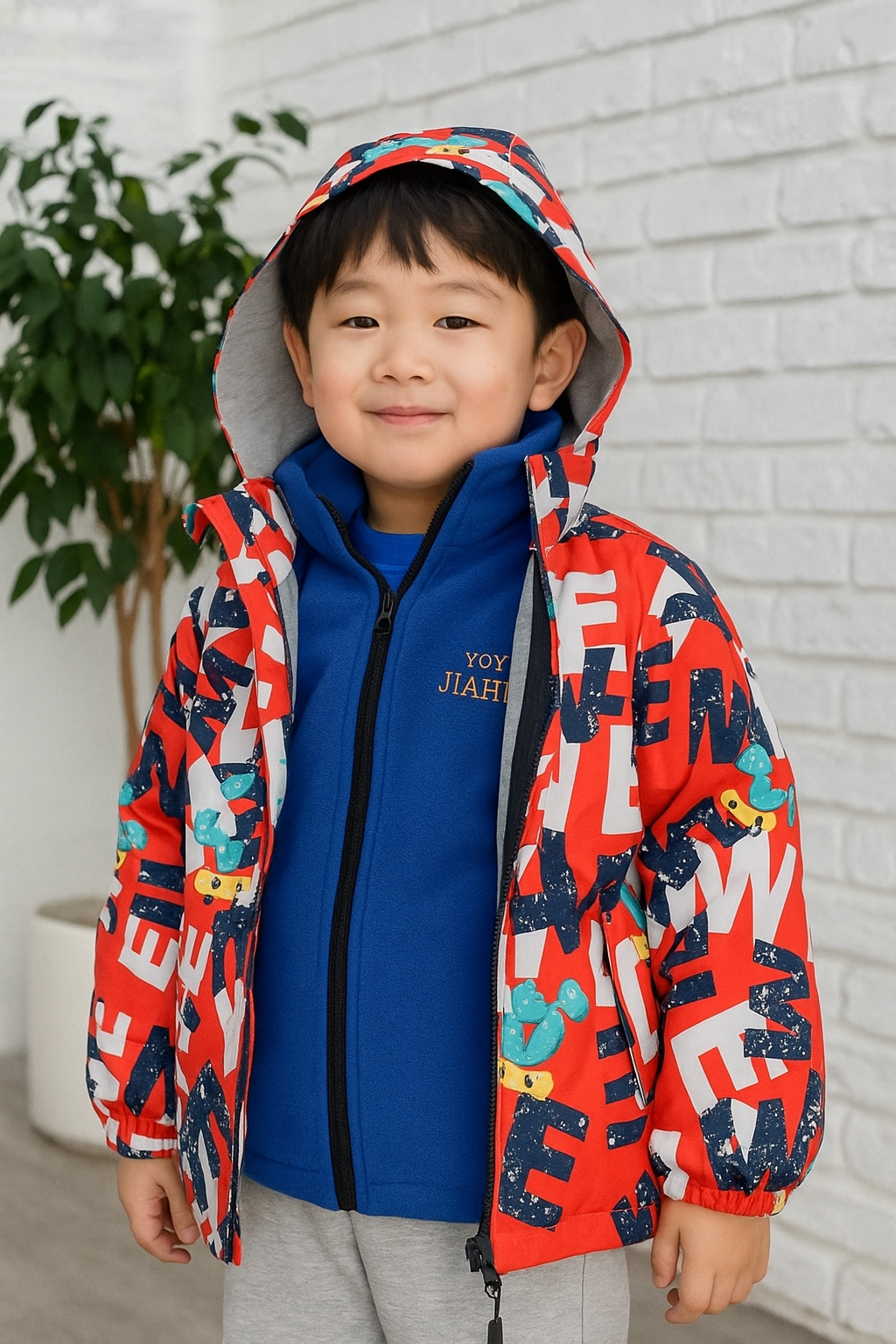 بارانی کلاهدار ضد آب که از دو قسمت سویشرت پلار و کاپشن بارانی تشکیل شده و از هم جدا میشن و میشه هر کدوم رو جدا استفاده کرد. کلاه با زیپ به بارانی وصل شده.